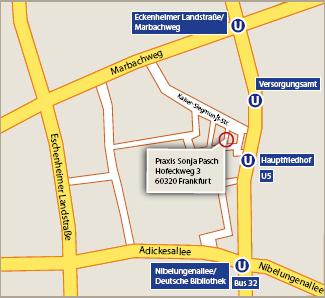 Die Praxis liegt in Frankfurt zwischen Hessischem Rundfunk und Hauptfriedhof (Dornbusch/ Eckenheim).